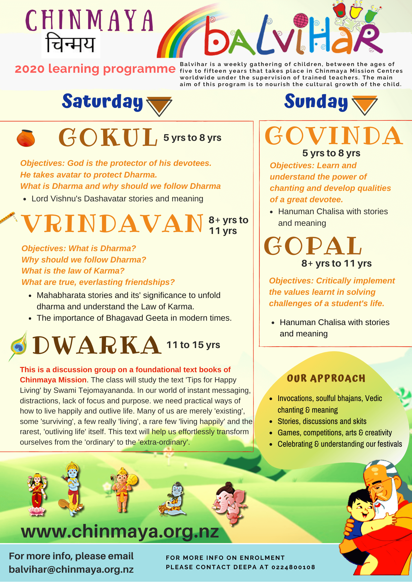 | 4.00 pm - 5:30 pm | 63, McKenzie Road, Mangere Bridge, Auckland | Age Group: 5 – 7 years – Junior Balvihar | Smitha, Jyoti, Vanita | balvihar@chinmaya.org.nz |